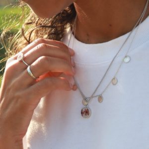 Pendant is approximately 8mm wide. Only 2mm deep. The satellite chain 1mm with 1.6mm beads and 18 inches long. Both sterling silver.